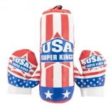 Leuke en veilige set voor kleine sporters: kinder-bokszak met handschoenen met het motief van de Amerikaanse vlag. Ideaal om energie kwijt te raken, coördinatie te ontwikkelen en spelenderwijs actief te zijn. Licht en compact, makkelijk mee te nemen en geschikt vanaf 3 jaar.