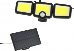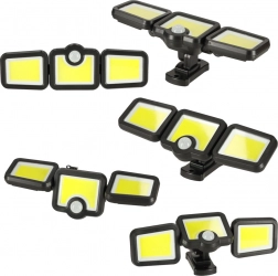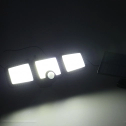 Krachtige buiten-zonne-LED-schijnwerper met drie verstelbare panelen, een losse zonnepaneelmodule en een geïntegreerde PIR-sensor. Biedt een brede lichtbundel tot 320°, automatisch inschakelen bij schemer en zuinige werking op zonne-energie. Ideaal voor het verlichten van erf, tuin, entree of oprit en voor extra veiligheid na zonsondergang.