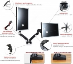 De bureausteun is ontworpen voor de montage van twee LED/LCD-monitoren van 13 tot 27 inch. Hij biedt een brede reeks instellingen, inclusief de pivotfunctie met 360 graden rotatie.