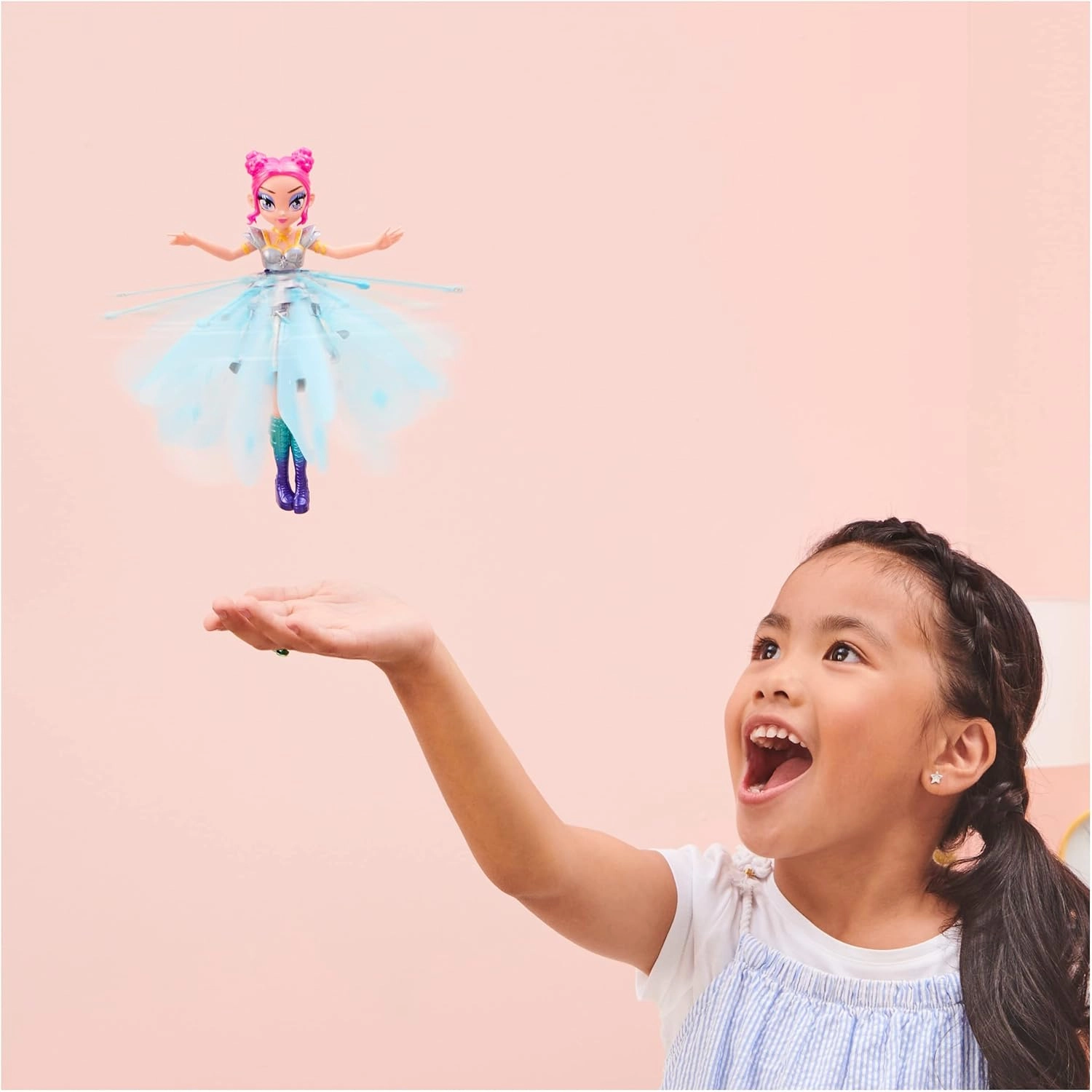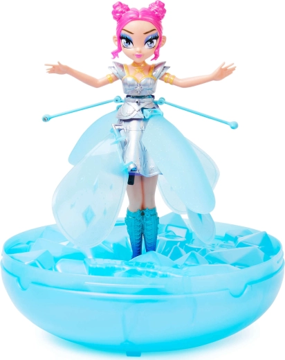 De vliegende Hatchimals Pixies-fee zit in een glinsterende kristallen behuizing die dient als elegante basis en beschermende cover. Na het starten stijgt de fee op met roterende vleugels en reageert gevoelig op de positie van je handen – lager houden laat haar dalen, hoger houden laat haar stijgen. Met een eenvoudige aanraking van de vleugels beëindig je de vlucht veilig.
