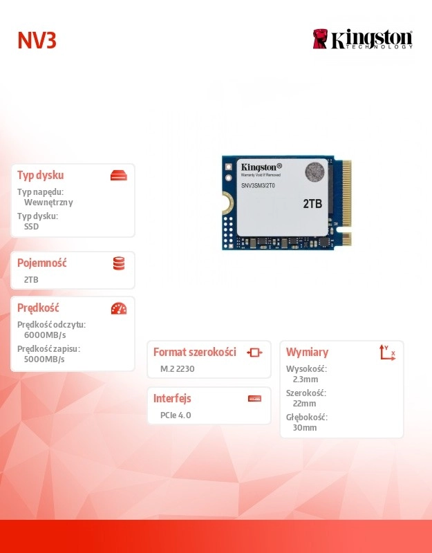 Breid je opslag uit en versnel je systeem met de Kingston NV3 SSD – een compacte M.2 2230 NVMe-oplossing met PCIe 4.0 en snelheden tot 6000/5000 MB/s. Ideaal voor laptops en draagbare spelconsoles, met laag energieverbruik en minimale warmteontwikkeling voor stabiele prestaties.