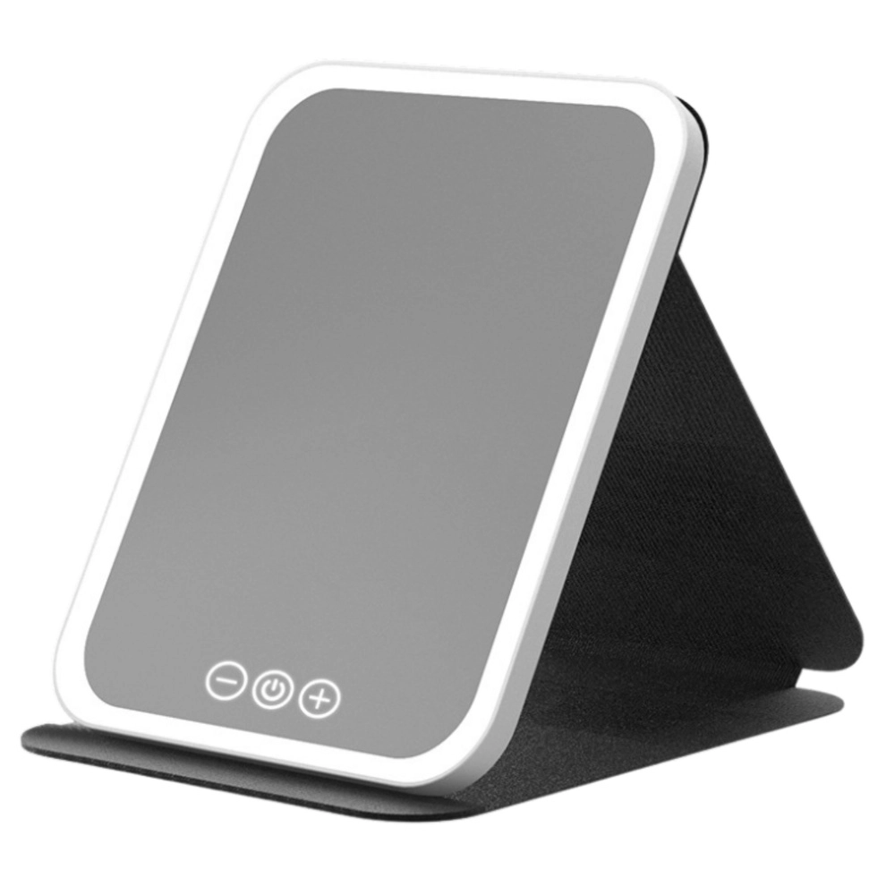 Elegante opvouwbare LED-spiegel, ideaal voor dagelijks make-up aanbrengen en huidverzorging. Biedt drie lichtkleuren (koud, warm, natuurlijk), traploze helderheidsregeling via touchbediening en een praktisch etui met standaard met drie ondersteuningsposities. Dankzij de ingebouwde 600 mAh-accu met USB-opladen is hij handig voor thuis en onderweg.