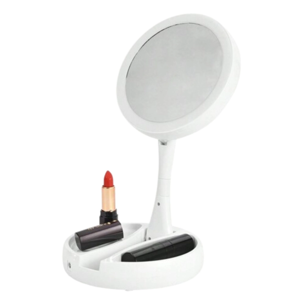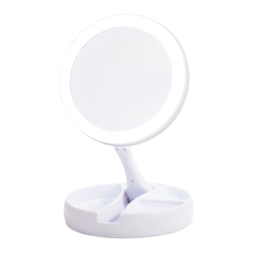 Elegante tafelspiegel met LED-verlichting en dubbelzijdig oppervlak (1× en 10× vergroting) is ideaal voor make-up, huidverzorging en het inzetten van lenzen. Dankzij de 180° draaibare constructie schakel je eenvoudig van zijde, terwijl de praktische organizer in de voet je cosmetica binnen handbereik houdt. Voeding via 4× AA-batterijen of MicroUSB-kabel voor maximaal gemak.