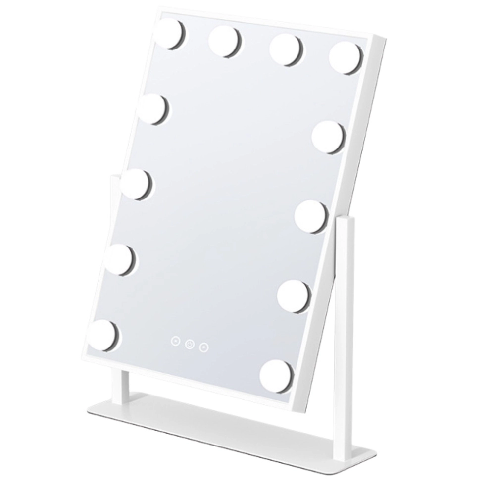 Elegant Hollywood-spiegel met 12 LED-lampen biedt egale en heldere verlichting voor perfect make-upen haarstyling. Het touchpaneel maakt 3 lichtkleuren mogelijk (warm, neutraal, koel wit) en traploos dimmen met geheugenfunctie. De stabiele metalen constructie en het 360° draaibare frame zorgen voor de ideale hoek. Een stijlvolle toevoeging voor kaptafel, badkamer en salon.