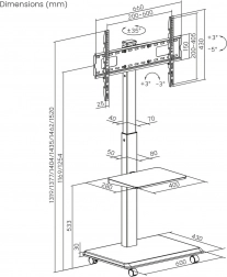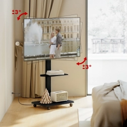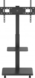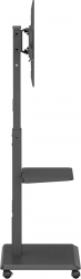 De brede basis met wielen en vergrendeling maakt soepel verplaatsen tussen ruimtes mogelijk en veilig vastzetten op de plek. De praktische plank biedt ruimte voor accessoires zoals spelers, set-top boxen of presentatiesystemen.