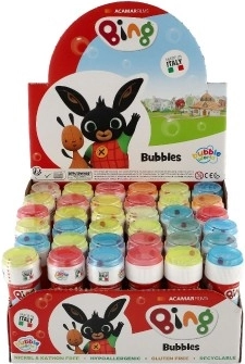 Bellenblaas BING 60 ml is een ideaal kleinigheidje voor dagelijks spel, verjaardagsfeestjes en kinderparty’s. Dankzij de geliefde personages uit de serie BING maakt het elke kleine fan blij. Het eenvoudige blazen van bellen stimuleert coördinatie, creativiteit en buitenspelen in de frisse lucht.