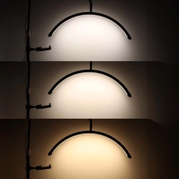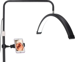 Professionele LED gebogen lamp voor cosmetica met een vermogen van 36 W biedt egale, schaduwvrije verlichting voor lash & brow styling, manicure, make-up en fotografie. Beschikt over een breid bereik van kleurtemperatuur 3000–5600 K, 10 helderheidsniveaus en een hoge kleurechtheid RA>90 voor natuurgetrouwe details. De stabiele metalen standaard met verstelbare hoogte en telefoonhouder vergemakkelijkt het werken en het maken van content voor sociale media.