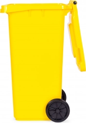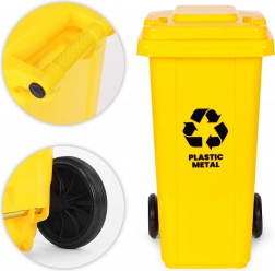 Duurzame gele vuilnisbak met een inhoud van 120 l voor het scheiden van plastic en metaal. Gemaakt van UV-bestendig HDPE, met rubberen wielen, ergonomische handgrepen, stabilisatiepootjes en een sluitend deksel. Compatibel met gemeentelijke systemen EN 840, ideaal voor huishoudens en bedrijven.