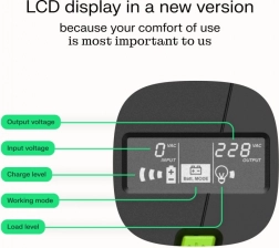 Het geïntegreerde LCD-display toont overzichtelijk de belangrijkste bedrijfsgegevens en het verbeterde paneel met lagere helderheid is prettiger voor de ogen. Dankzij de snelle omschakeltijd < 10 ms is ononderbroken werking gewaarborgd. De beschermingsfuncties worden aangevuld met een RJ45-poort tegen overspanning voor het beveiligen van het netwerk en aangesloten apparaten.