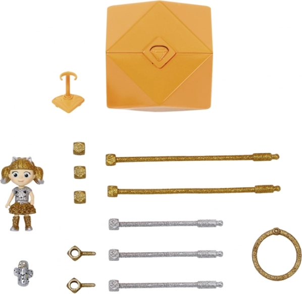 - Pop in drie delen (hoofd, romp, benen), hanger, 2× connector, 3× scheider, 1× ring, 5× gekleurd verbindingskoord, 1× popstandaard, “diamanten” verpakking