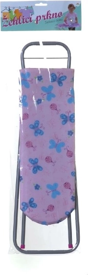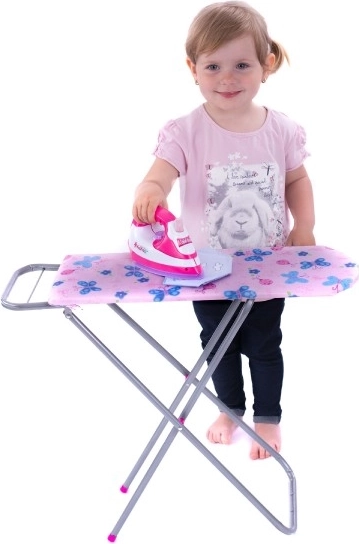 Schattige kinderstrijkplank met een stevige metalen constructie en een houten blad, ideaal voor rollenspel in het huishouden. Biedt een stabiel oppervlak, een inklapbare constructie voor eenvoudig opbergen en een kleurrijke hoes met motieven die kinderen leuk vinden. Geweldig voor de ontwikkeling van de fantasie en de fijne motoriek. Alleen strijkplank, zonder strijkijzer.