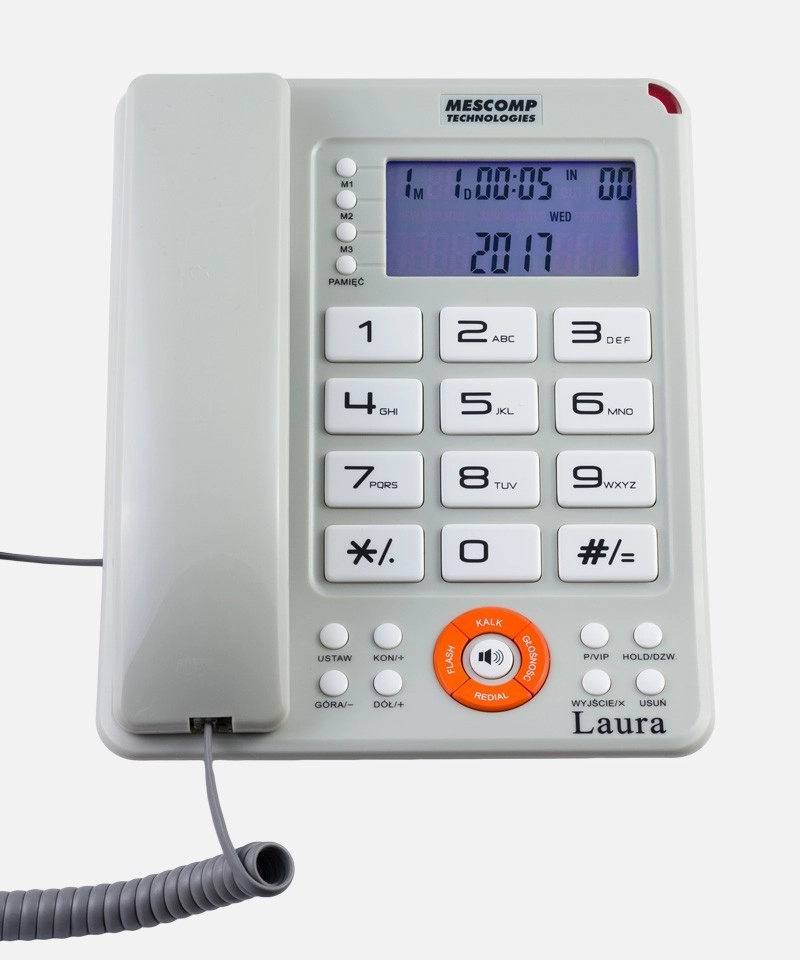 De stijlvolle bureautelefoon Mescomp Laura MT-816 is ideaal voor thuis en kantoor. Hij biedt een groot verlicht display, grote toetsen voor comfortabele bediening en een reeks slimme functies zoals belleridentificatie, snelkeuze, luidsprekerfunctie en optische oproepsignalering.