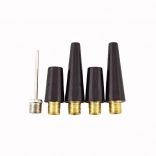 De set adapters, waaronder een naaldventiel en conische sproeiers, dekt het oppompen van ballen, speelgoed en matrassen – gewoon opschroeven en beginnen.