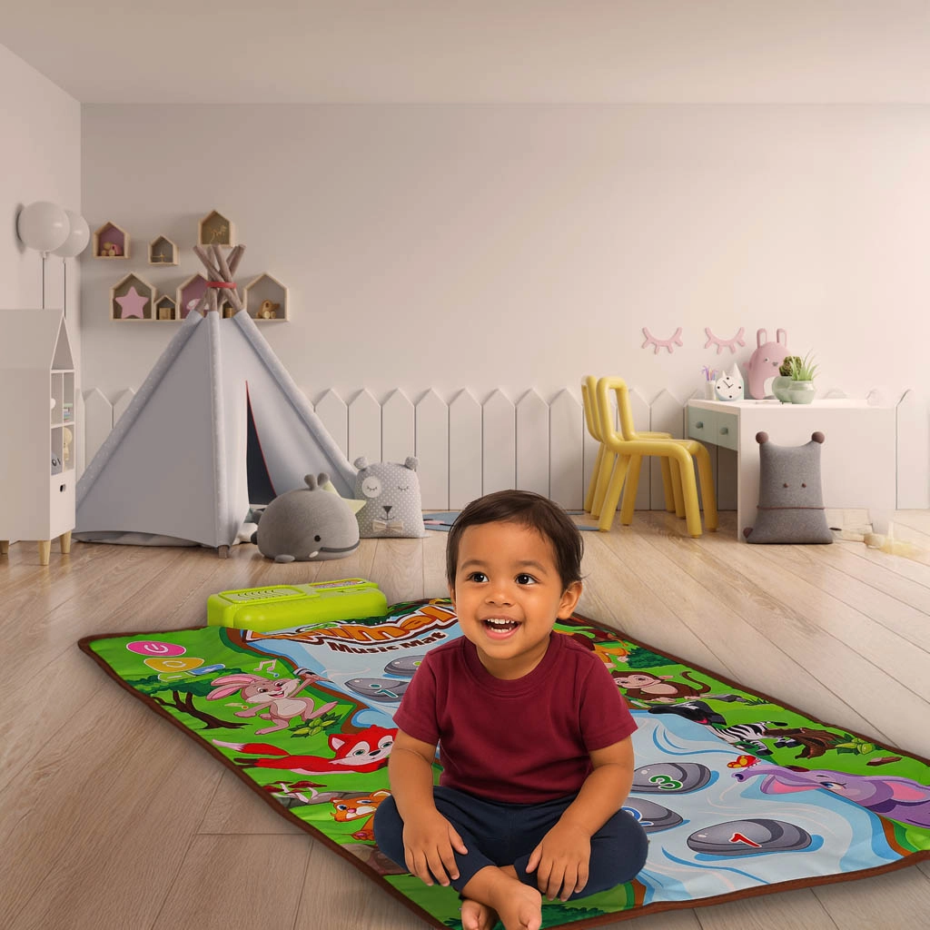 Dankzij gevoelige aanraakzones reageert de mat op elke stap en aanraking – speelt melodieën, realistische dierengeluiden af en motiveert kinderen om te bewegen. Intuïtieve bediening (aan/uit, volumeregeling, nummers overslaan) zorgt voor eenvoudig gebruik voor zowel kinderen als ouders.