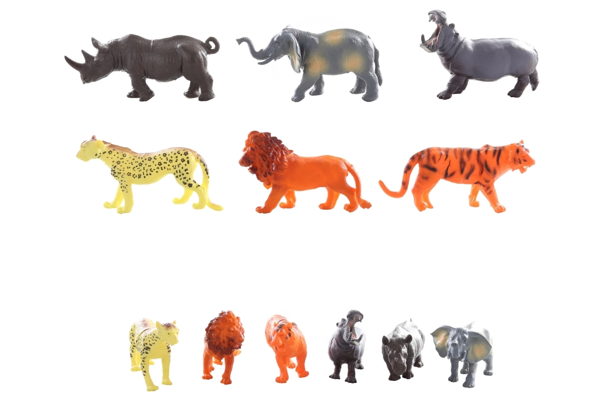 In de verpakking vind je 12 stuks – telkens 2x nijlpaard, neushoorn, olifant, tijger, leeuw en jachtluipaard. De figuren zijn geschikt voor creatief spelen, schoolprojecten en thematische decoraties.