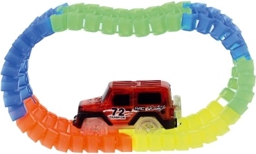 Bouw je eigen lichtgevende racebaan en stuur het snelle autootje de baan op! De flexibele stukken kun je eenvoudig in allerlei vormen buigen; de baan telt 57 delen en is 72 cm lang, en het autootje met 3 knipperende lampjes rijdt op 1× AA-batterij (niet inbegrepen). Ideaal voor kinderen vanaf 3 jaar – plezier, creativiteit en ontwikkeling van de fijne motoriek.