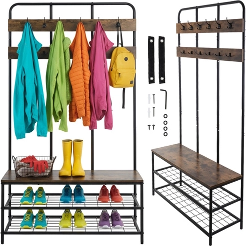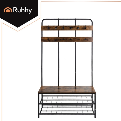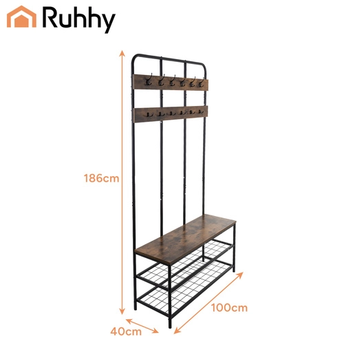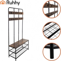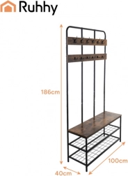 Elegante en praktische halrek RUHHY combineert een stabiele metalen constructie, twee ruime schoenenplanken, een comfortabele zitting en 12 dubbele haken voor maximale orde. De stijlvolle loft-look met houtdecor past in zowel moderne als klassieke interieurs en dankzij de snelle montage is alles binnen enkele minuten klaar.