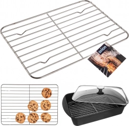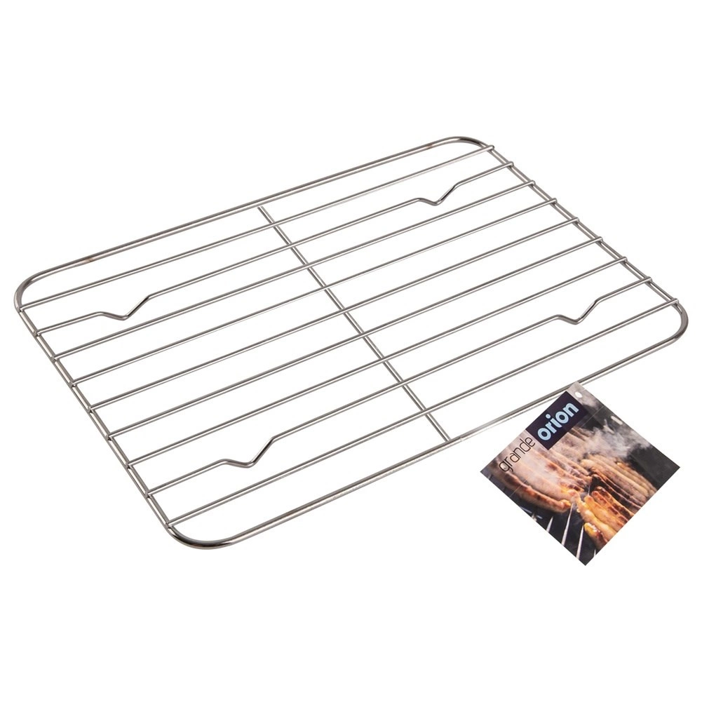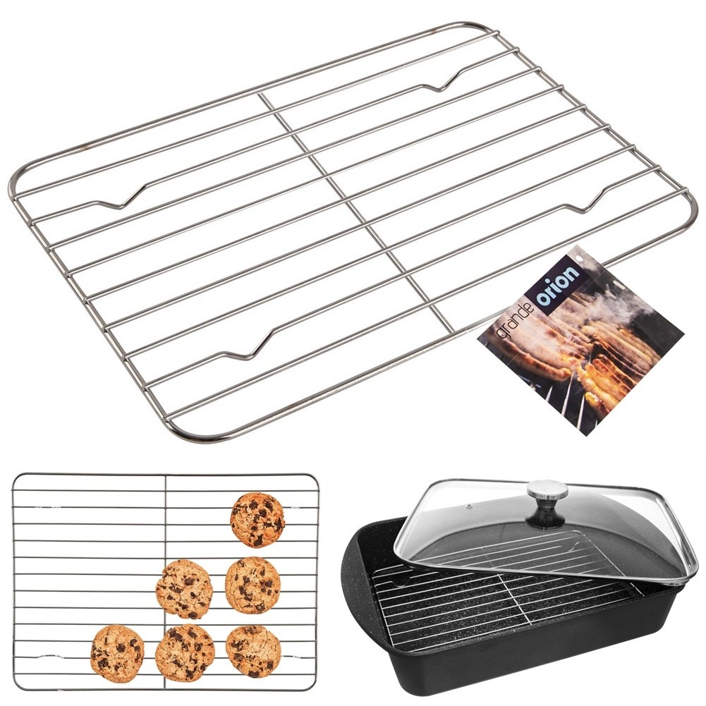 Universeel metalen rooster voor in de braadslede en koelrooster in één met afmetingen 32 × 23 × 1,2 cm. Ideaal voor het bakken van vlees zonder overtollig vet, voor afkoelen en decoreren van taarten en koekjes en ook als hittebestendige onderzetter voor heet kookgerei. Gemaakt van verchroomde stalen draad voor een lange levensduur.