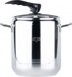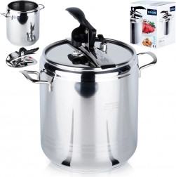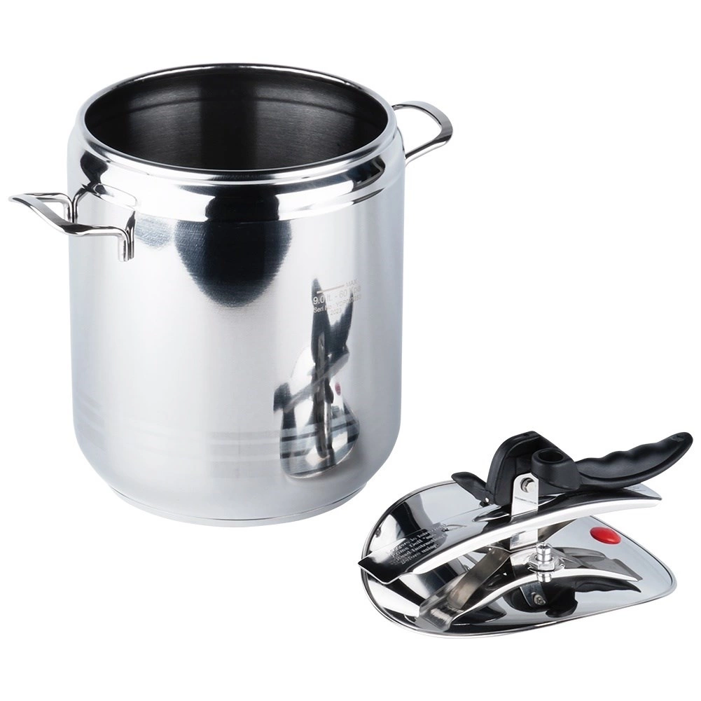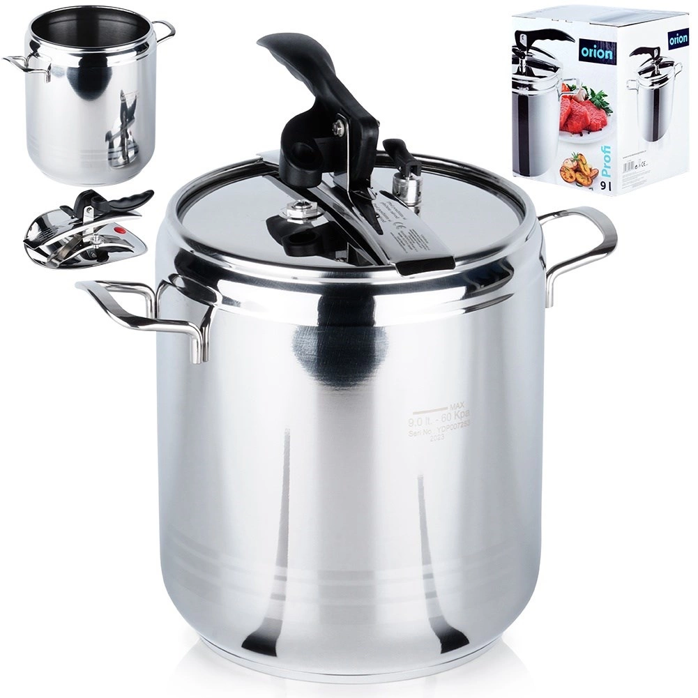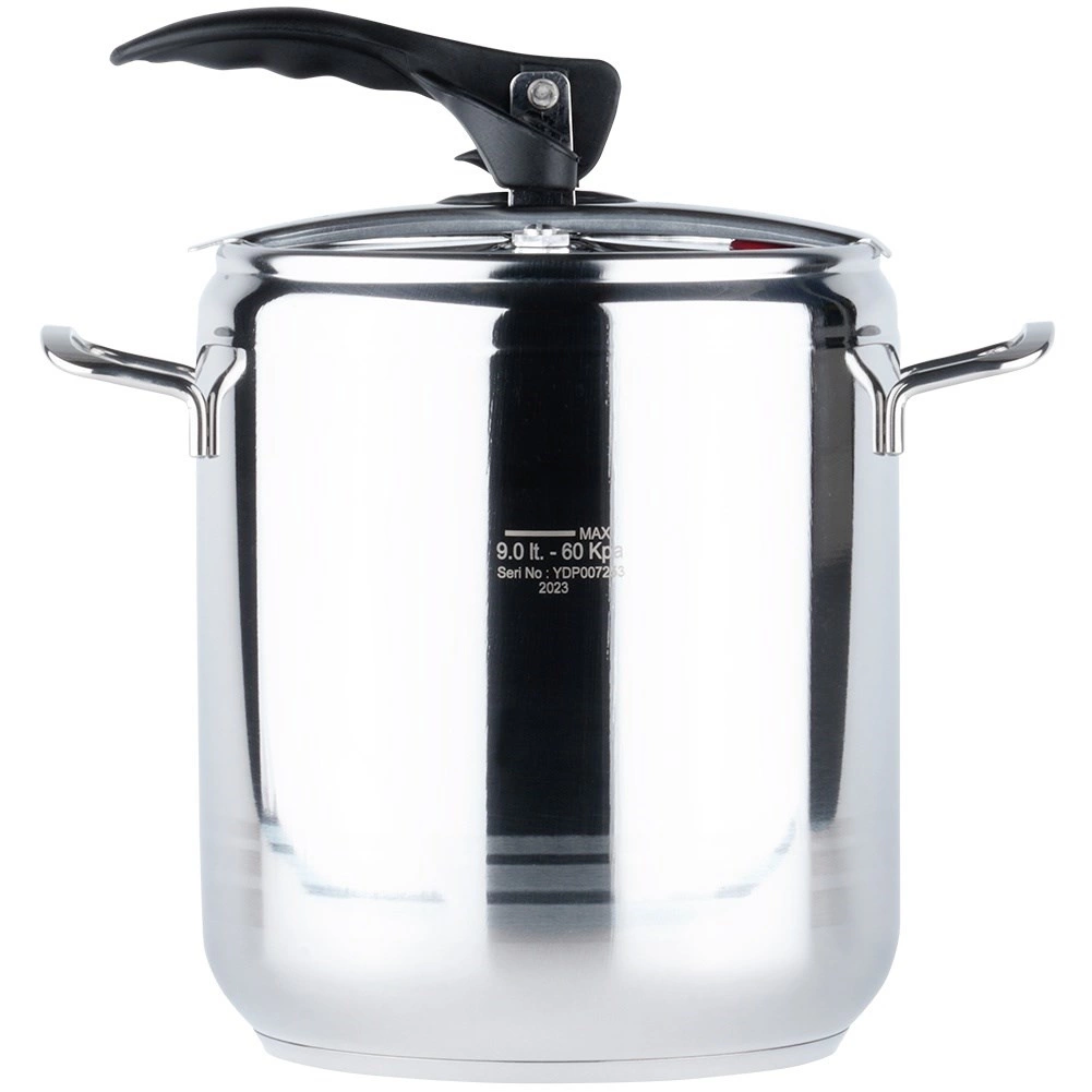 Grote RVS snelkookpan met een inhoud van 9 l voor snel en energiezuinig koken onder druk. Biedt snellere bereiding, energiebesparing, veilig gebruik met 2 veiligheidsventielen en een robuste 3-laagse bodem voor gelijkmatige warmteverdeling. Geschikt voor alle soorten kookplaten, inclusief inductie, en het lichaam is vaatwasmachinebestendig (zonder deksel).