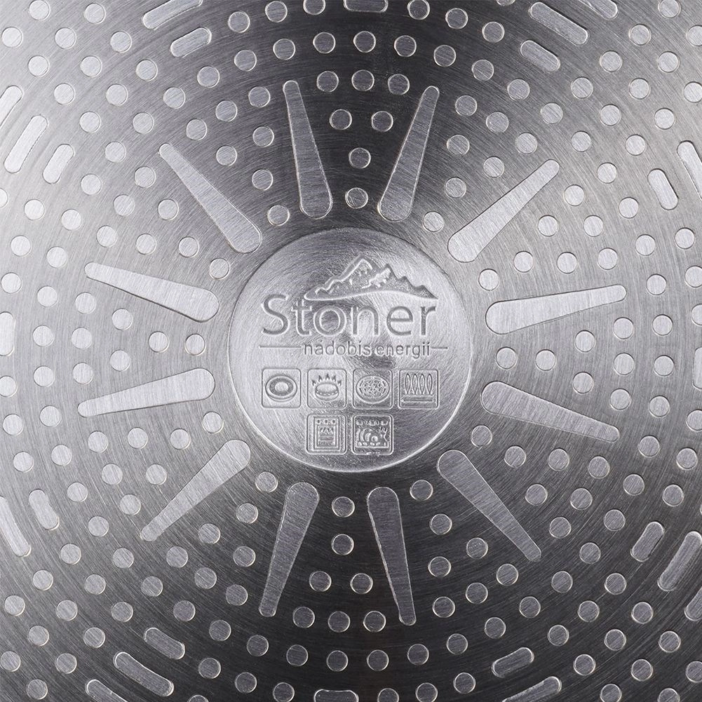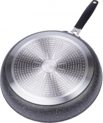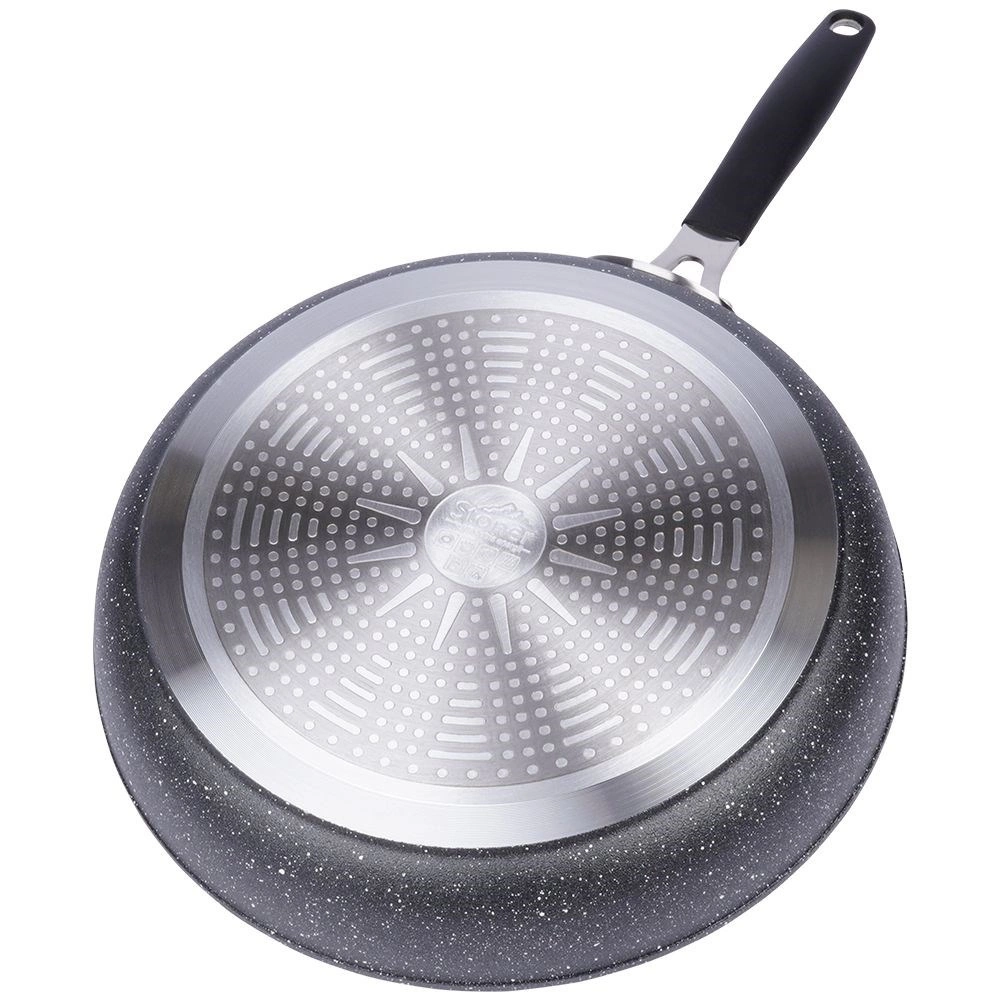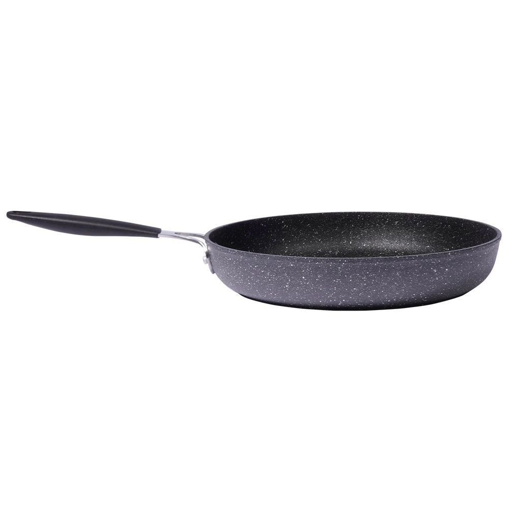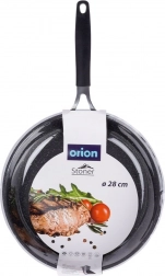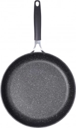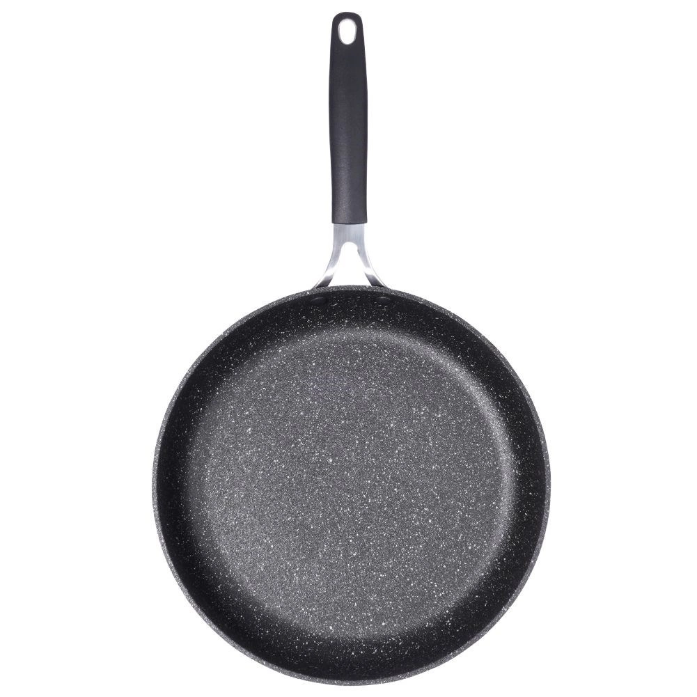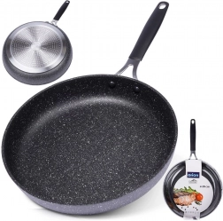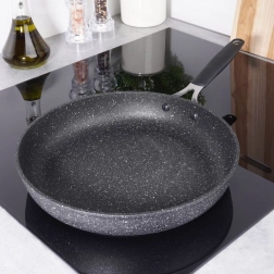 Robuuste granieten pan STONER met een diameter van 28 cm, gegoten aluminium met stenen oppervlak voor dagelijks koken. Biedt een antiaanbaklaag voor gezond bakken met minimaal vet, snelle en gelijkmatige warmteverdeling, compatibel met alle soorten kookplaten, inclusief inductie en een ergonomische handgreep met ophangoog. Ook ovenbestendig (handgreep tot 200 °C), eenvoudig te reinigen en vrij van PFOA en PTFE.