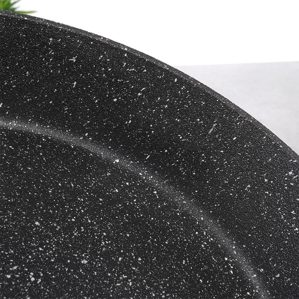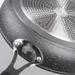 De steenachtige afwerking zorgt voor gemakkelijk loslaten van gerechten, minder vetverbruik en snelle reiniging zonder aanbakken.