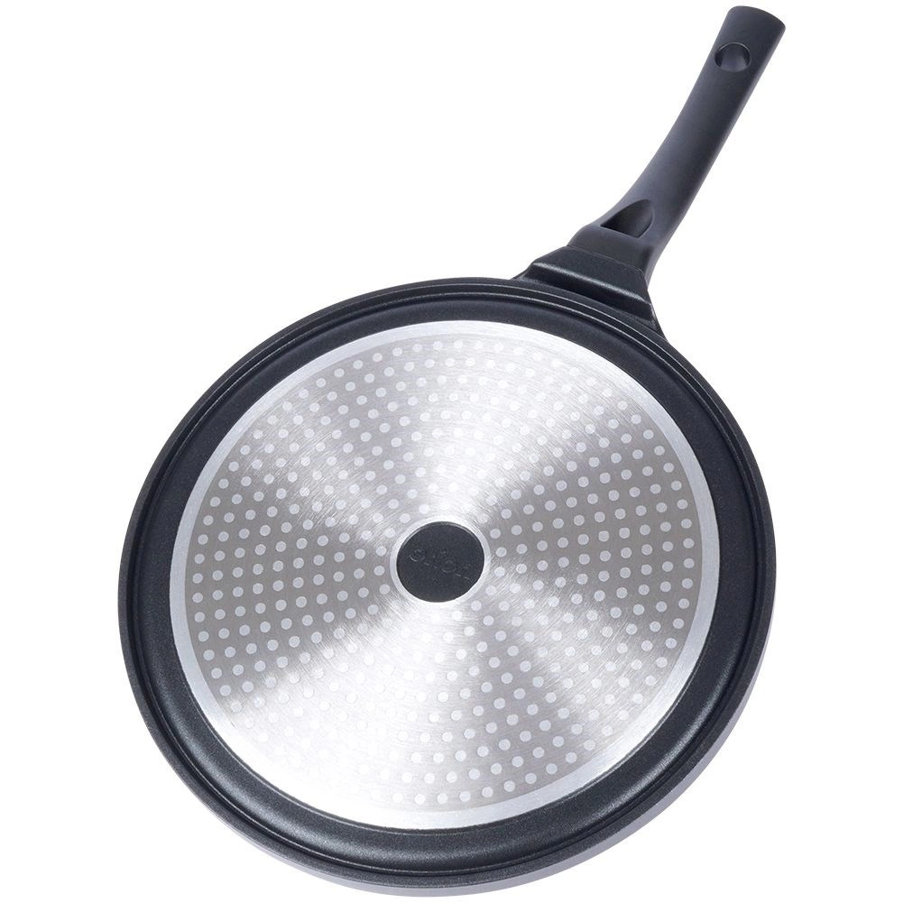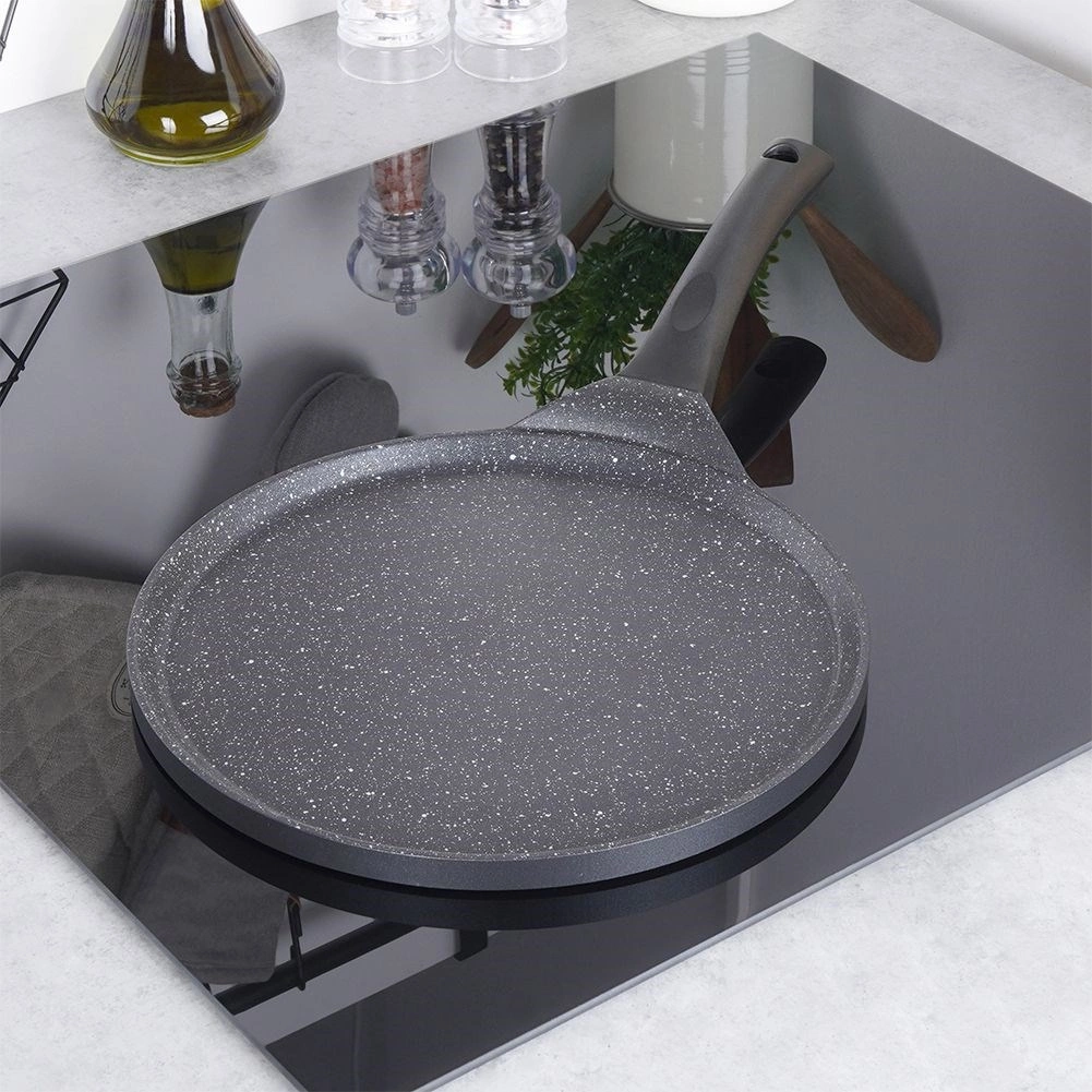 Ontdek de praktische GRANDE pannenkoekenpan met granieten afwerking, die zorgt voor perfect gelijkmatig bakken en eenvoudig omdraaien. De anti-aanbaklaag zonder PFOA en PTFE is voedselveilig en minimaliseert de behoefte aan olie, zodat u lichte en knapperige pannenkoeken, pancakes en omeletten bereidt.
