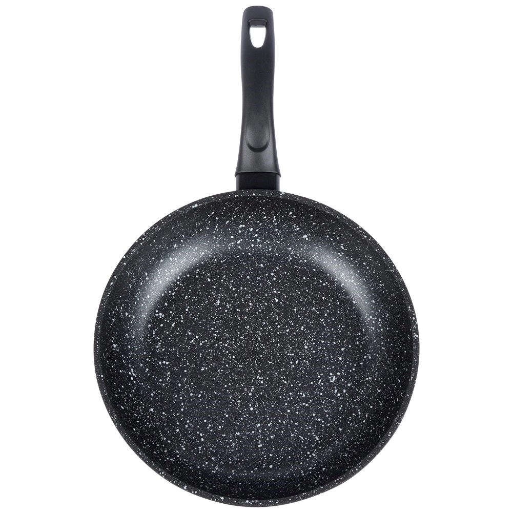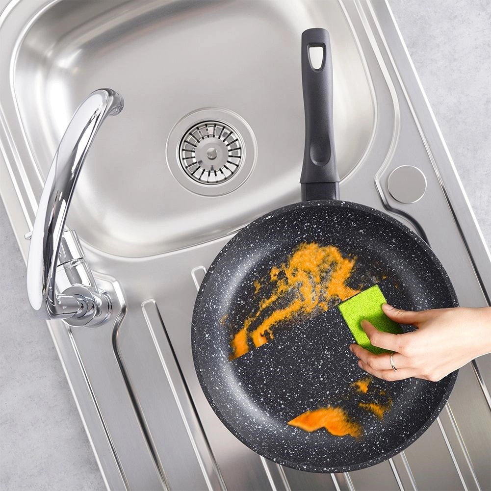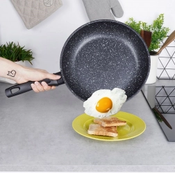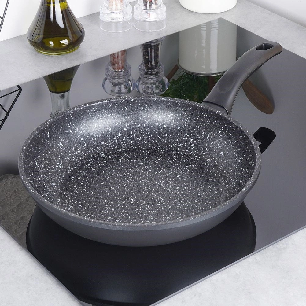De granietpan ORION Grande 28 cm combineert een massieve aluminium gietbody met een duurzaam antiaanbakoppervlak dat zorgt voor soepel bakken zonder aanbranden. Dankzij de hogere randen is hij ideaal voor sappige steaks, knapperige groenten en luchtige pannenkoeken. De tijdloze steenlook benadrukt de stijl van elke keuken.