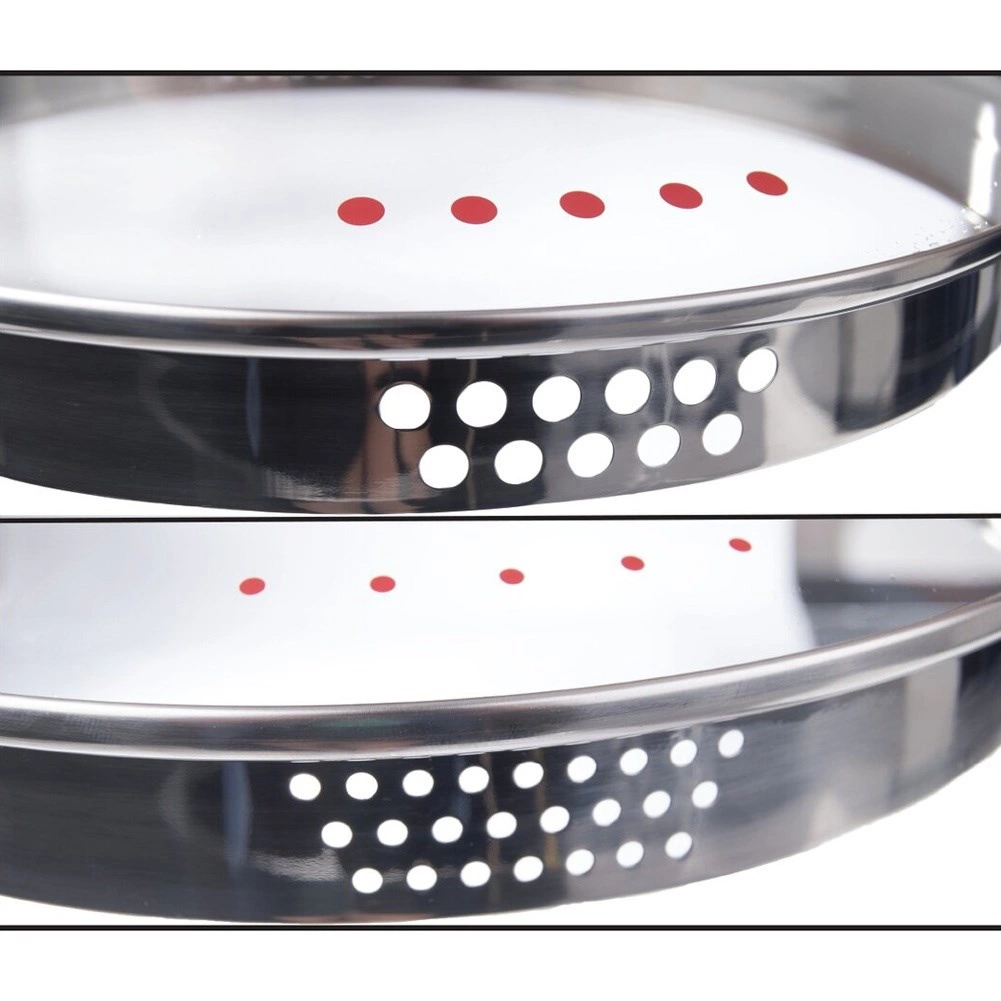 Praktisch glazen deksel met geperforeerde rand houdt ingrediënten binnen en maakt veilig en comfortabel afgieten mogelijk zonder vergiet.