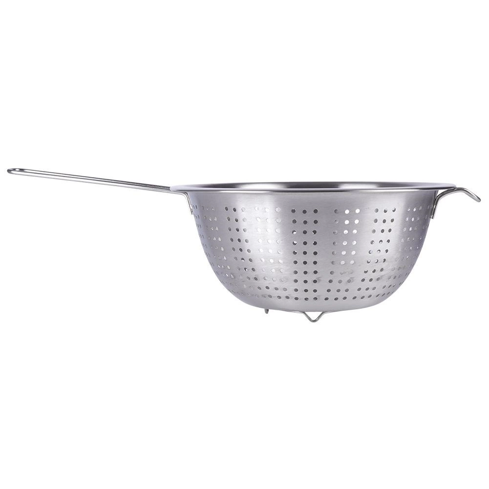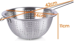 Praktisch roestvrijstalen vergiet met een diameter van 24 cm, een lange handgreep en stabiele pootjes – ideaal voor dagelijks keukenwerk. Perfect voor het afgieten van pasta, het afspoelen van fruit en groenten en rijst. Dankzij het hoogwaardige roestvrij staal is het duurzaam, makkelijk schoon te maken en heeft het een comfortabele grip plus de mogelijkheid om op te hangen.