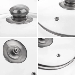 De ingebouwde ontluchtingsopening helpt overtollige stoom af te voeren en voorkomt overkoken. Het licht bolle profiel bevordert een efficiënte warmtecirculatie, waardoor het eten gelijkmatiger en sneller gaart. De strakke rand voorkomt wegglijden en beperkt spatten van water en vet rond het fornuis.