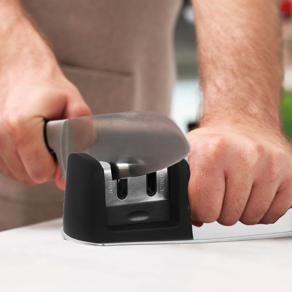 De slijper is een universele keuze voor roestvrijstalen, gecoate stalen en keramische messen en is ideaal voor alledaagse keukenmessen, inclusief koks-messen. Dankzij de slimme indeling en de eenvoudige geleiding van het lemmet bereikt u consistente resultaten in slechts enkele halen.
