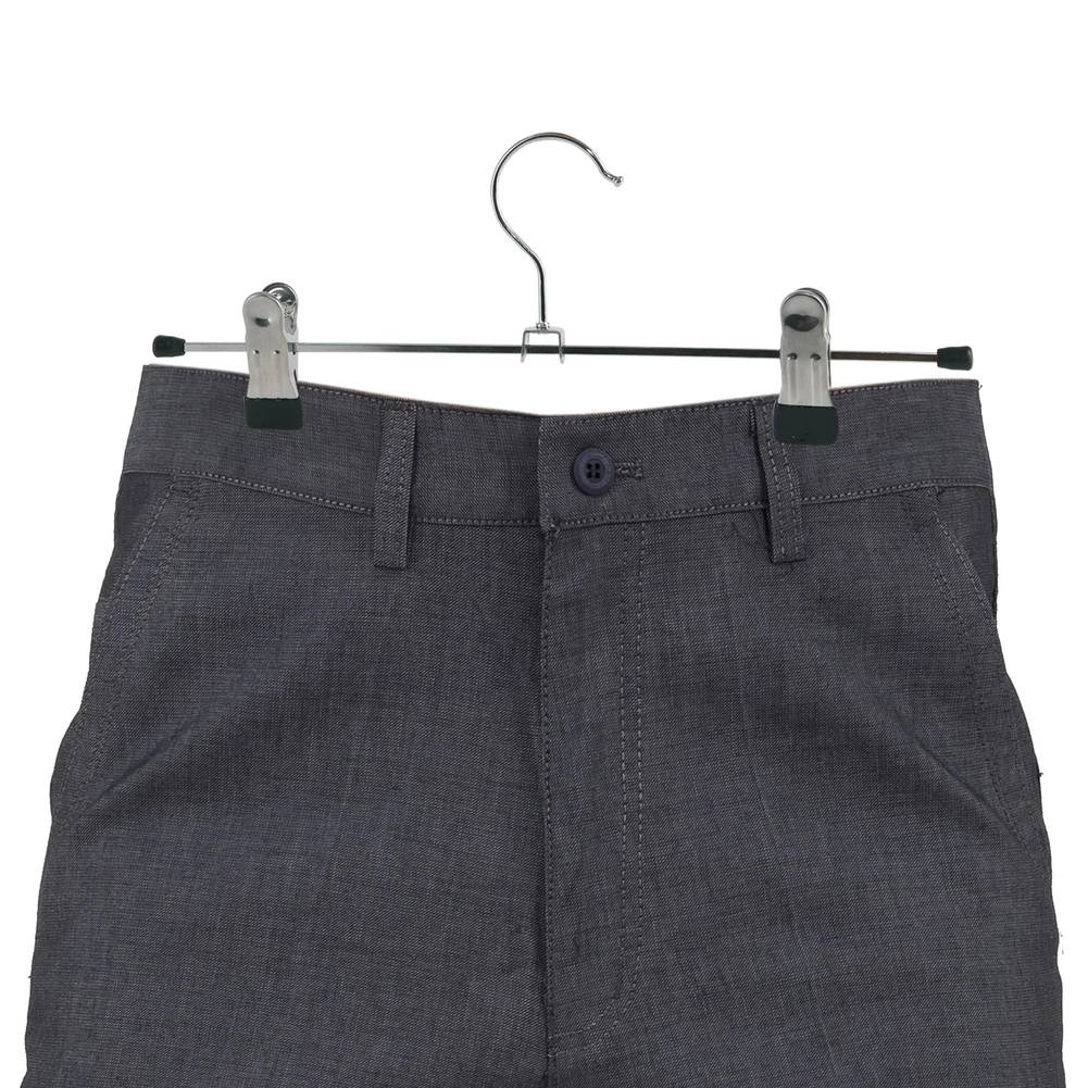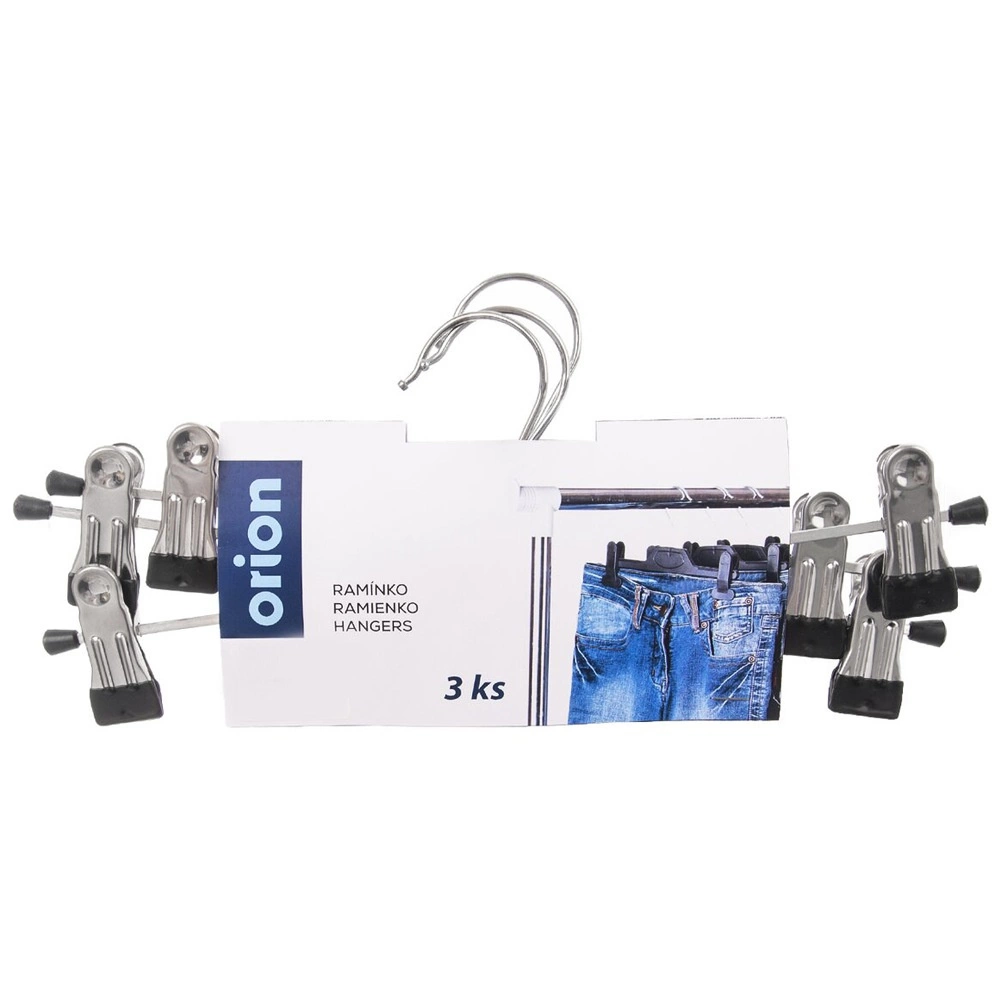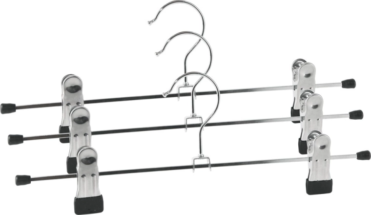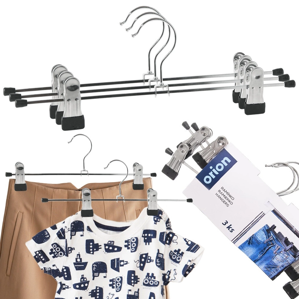 Praktische set van drie metalen hangers met klemmen voor overzichtelijke opslag van broeken en andere kleding. De hangers zijn van hoogwaardige metalen kwaliteit, hebben verstelbare klemmen, besparen ruimte in de kledingkast en helpen kreukvorming te voorkomen. Ideaal voor jeans, nette broeken, rokken en kinderkleding.