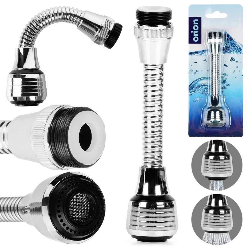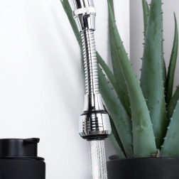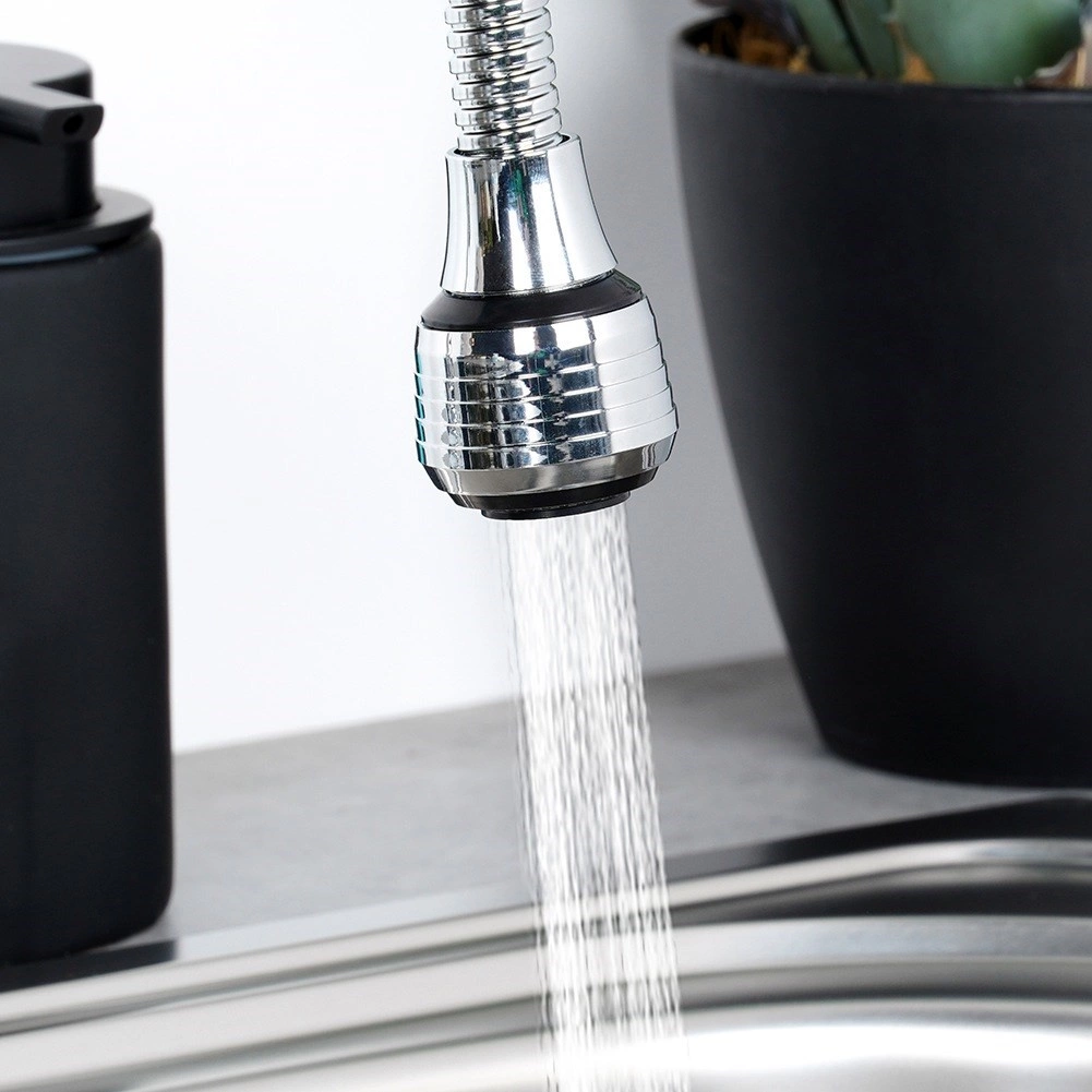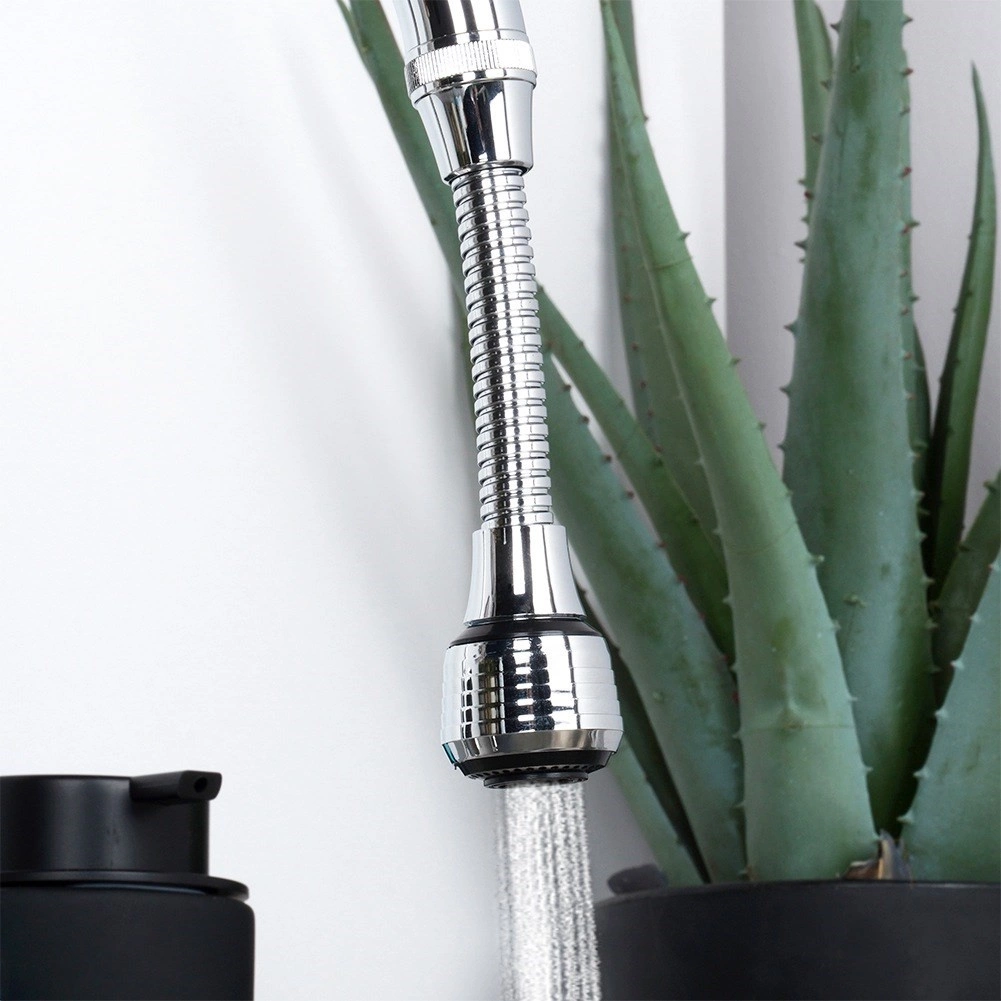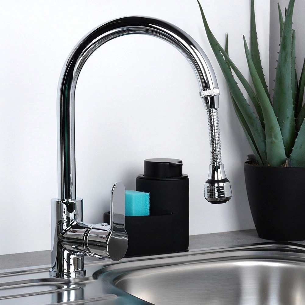 De flexibele zwanenhals maakt precies richten van de straal mogelijk en beperkt spatten. De universele aansluiting met buiten- en binnendraad zorgt voor compatibiliteit met de meeste standaardkranen. De duurzame uitvoering in zilver‑zwart design is praktisch en onderhoudsvriendelijk.