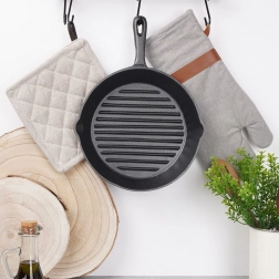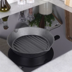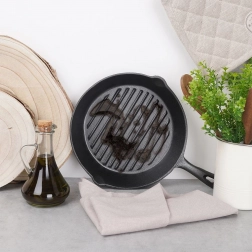 Deze gietijzeren grillpan 24 cm is ideaal voor intensief roerbakken, braden en grillen. Het zware gietijzer warmt gelijkmatig op en houdt de temperatuur lang vast, waardoor gerechten langer warm en sappig blijven. Het geribbelde binnenoppervlak voert overtollig vet af en zorgt voor een aantrekkelijke grillafdruk.