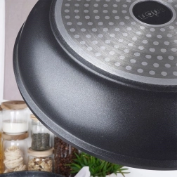 De praktische ergonomische handgreep wordt niet warm en zorgt voor een veilige grip. De pan is universeel voor alle soorten kookplaten, inclusief inductie, en is gemakkelijk schoon te maken – afspoelen is voldoende of plaats hem in de vaatwasser.
