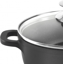 Compacte granieten pan met een diameter van 16 cm en een inhoud van 1,4 l, gemaakt van duurzaam aluminium met een interne anti-aanbak granieten PFLUON-coating zonder PFOA en PTFE. Wordt geleverd met een glazen deksel met roestvrijstalen rand en stoomontsnappingsopening. Geschikt voor alle soorten kookplaten, inclusief inductie, voor in de oven (deksel tot 200 °C) en in de vaatwasser. Geleidt warmte uitstekend voor snel en energiezuinig koken en stoven.