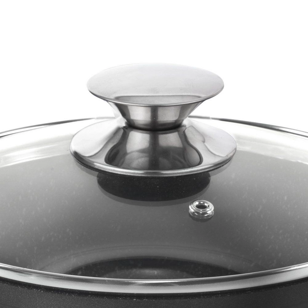 Het transparante deksel met roestvrijstalen rand en stoomopening vergemakkelijkt kookcontrole en behoudt vocht en smaak van gerechten.