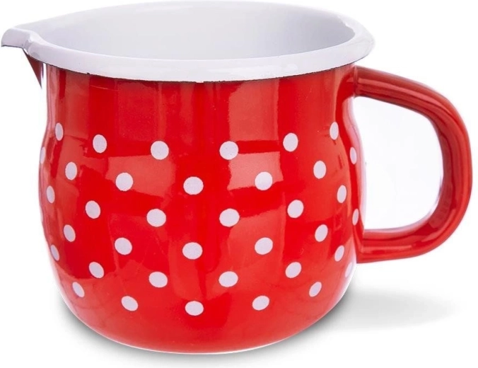 Stijlvolle geëmailleerde mok met schenktuit in rode kleur met witte stippen, inhoud 800 ml, ideaal voor dagelijks gebruik. Dankzij het stevige staal en de hoogwaardige geëmailleerde afwerking is hij veilig voor de gezondheid, geschikt voor allergiepatiënten en gemakkelijk te reinigen. Hij is universeel voor het verwarmen en serveren van dranken en compatibel met gas-, elektrische, keramische, halogeen- en inductiekookplaten.