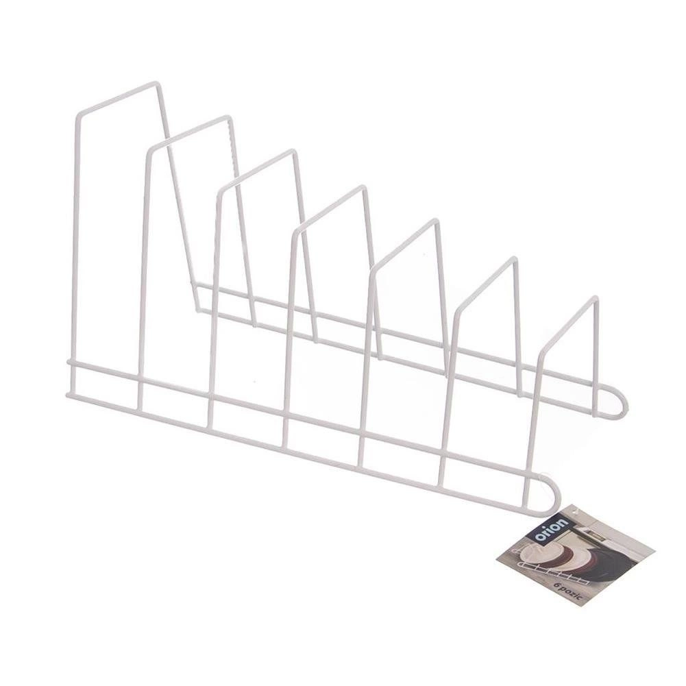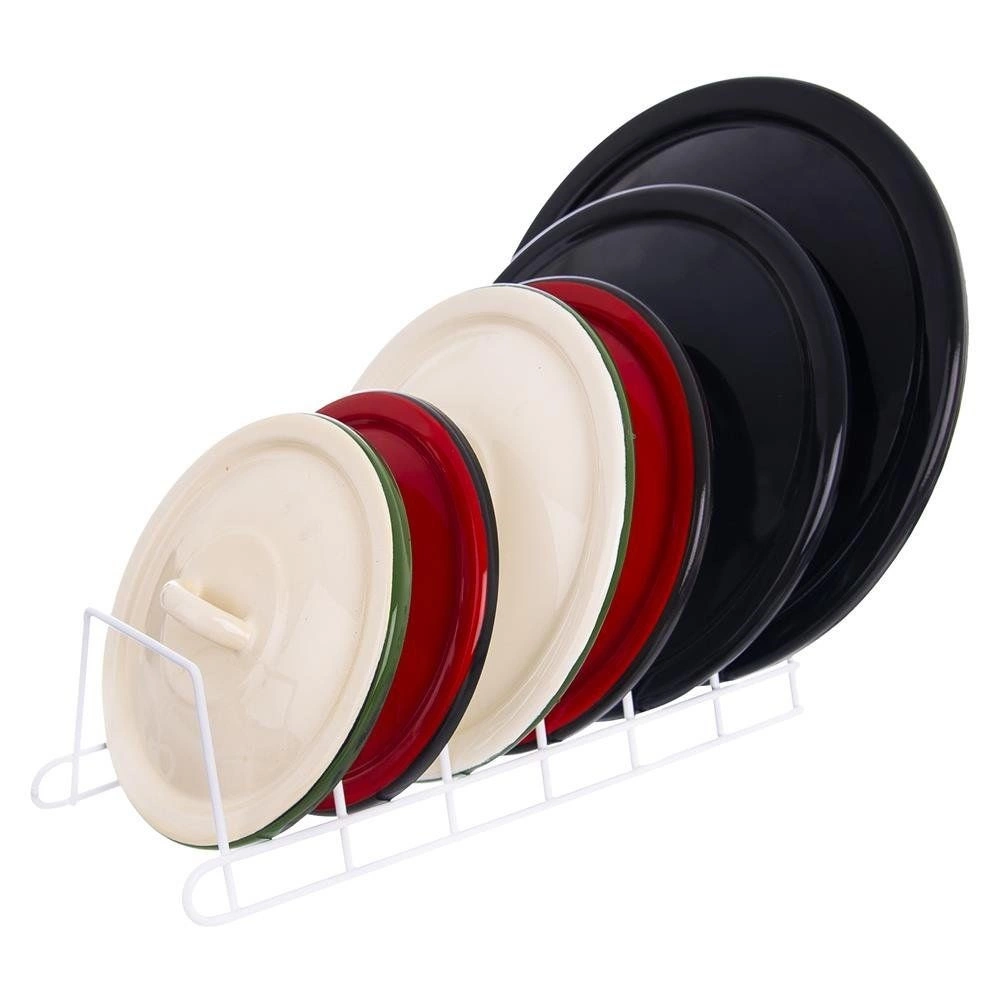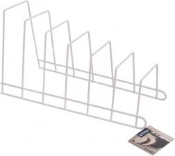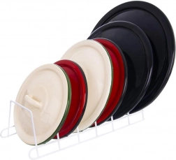 Praktische metalen keukenorganizer voor verticale opslag van maximaal 6 deksels, borden of snijplanken. De stabiele draadconstructie in wit bespaart ruimte in kasten en lades, zorgt voor overzicht en beschermt deksels tegen krassen. Makkelijk te reinigen en past perfect in zowel moderne als klassieke keukens.