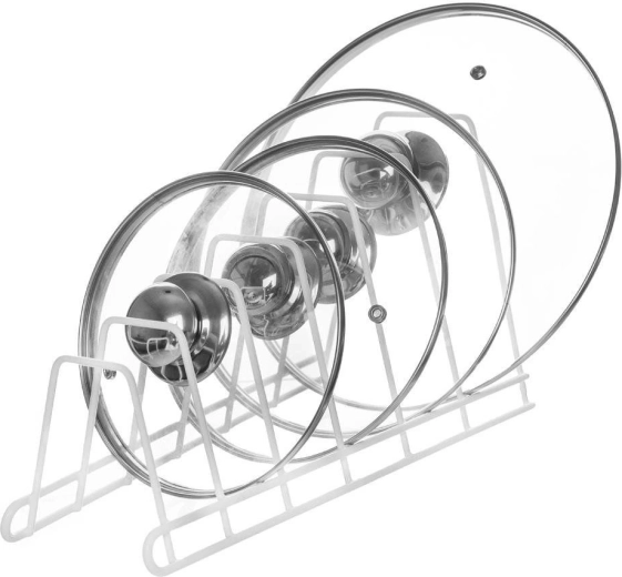 De standaard is geschikt voor verschillende maten en types – van deksels met knop tot platte borden en snijplanken, zowel in de kast als op het aanrecht.