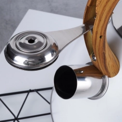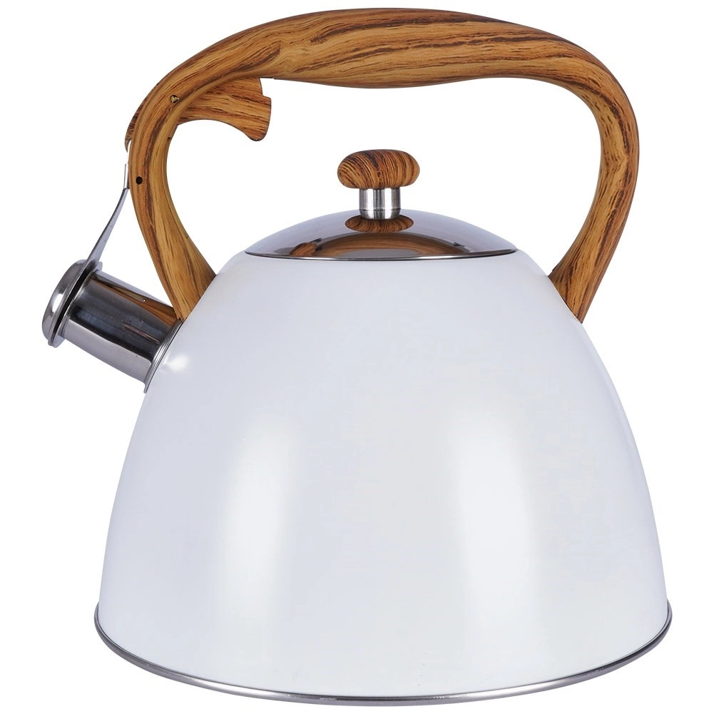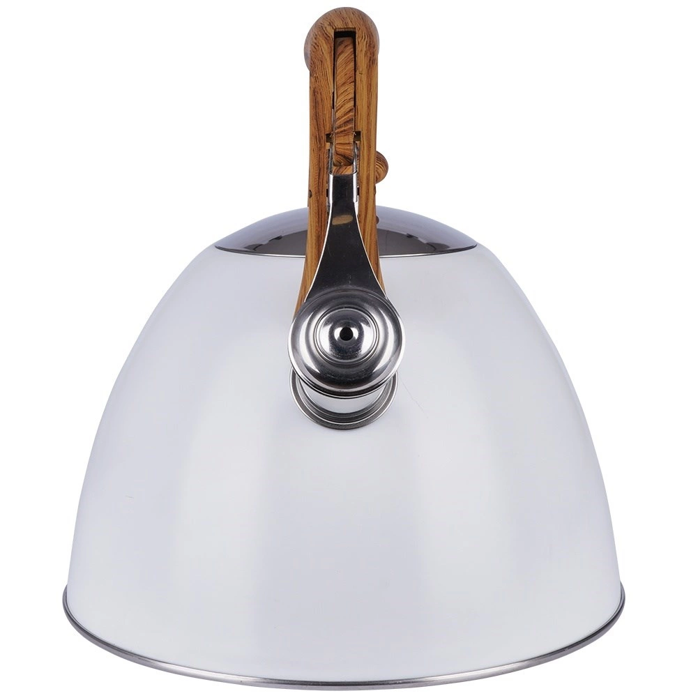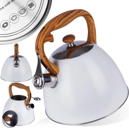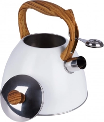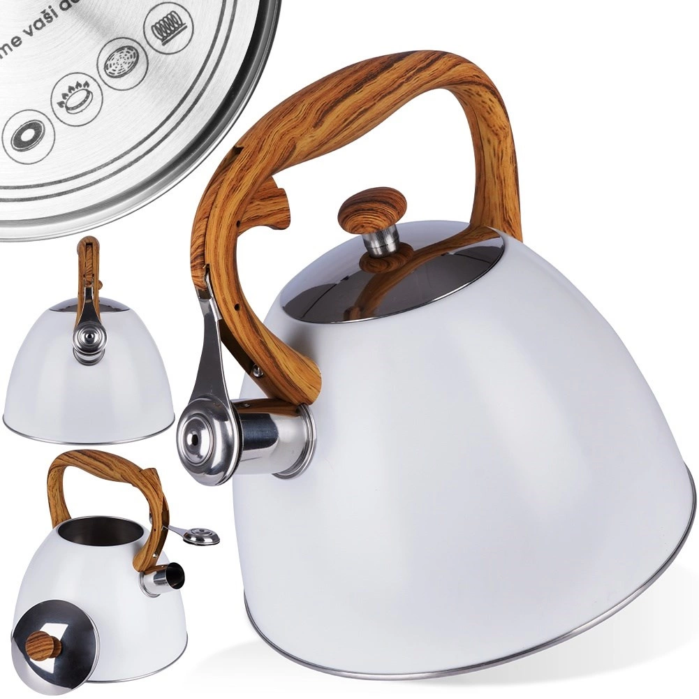 Deze klassieke, strak vormgegeven ketel combineert duurzaam roestvrij staal met een modern wit oppervlak en een comfortabel handvat in houtdecor. De fluit met automatisch openen in het handvat maakt schenken eenvoudig, terwijl het brede deksel het bijvullen en reinigen vergemakkelijkt. Dankzij het hoogwaardige materiaal wordt de smaak van het water niet beïnvloed en is de warmteoverdracht efficiënt.