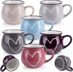Stijlvolle set van zes keramische mokken met een inhoud van 320 ml in verschillende kleuren met een hartjesmotief. Elke mok heeft een comfortabel oor en een moderne glazuur met een donkere rand. Geschikt voor thee, koffie en cacao, en ze kunnen in de vaatwasser en in de magnetron. Hoogwaardige keramiek voor dagelijks gebruik en een tijdloos design dat mooi combineert met de rest van je servies.