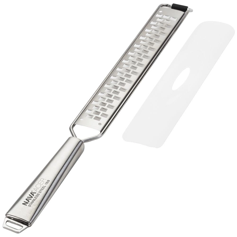 De universele roestvrijstalen rasp NAVA uit de Acer-lijn is ontworpen voor precies raspen tot fijne sliertjes en vlokken. Het lange lichaam met fijne tandjes kan overweg met Parmezaan, citruszeste, knoflook, chocolade en specerijen zoals gember, kaneel of nootmuskaat. Het rubberen uiteinde onderaan beschermt pannen en schalen tegen krassen en verhoogt de stabiliteit tijdens het werken.
