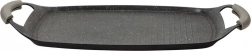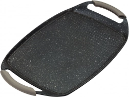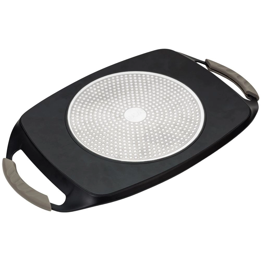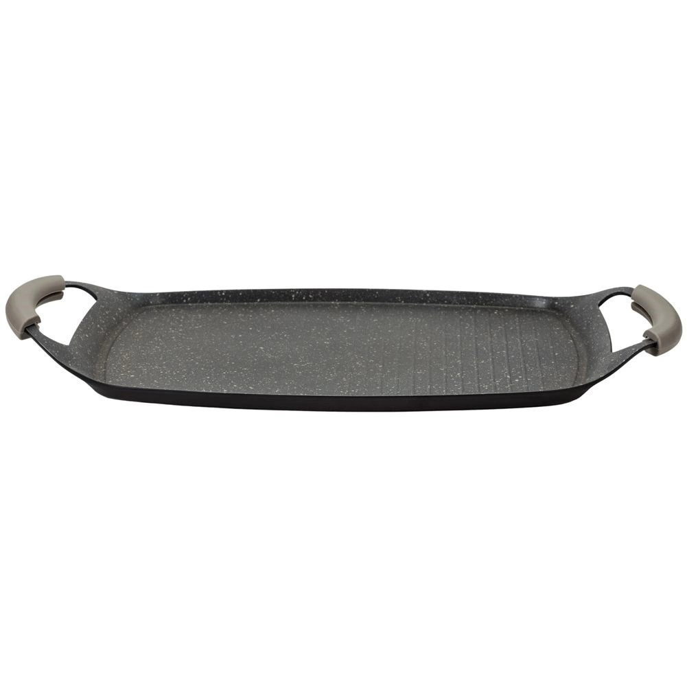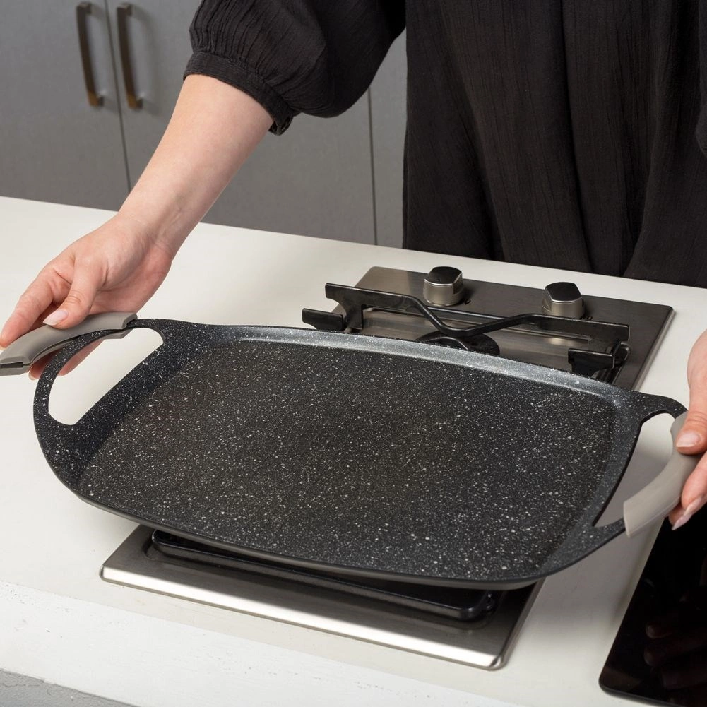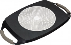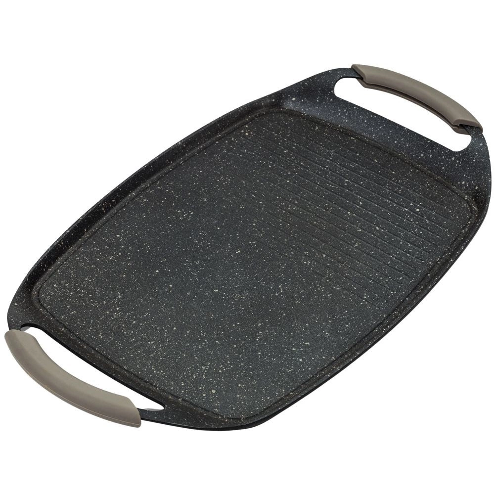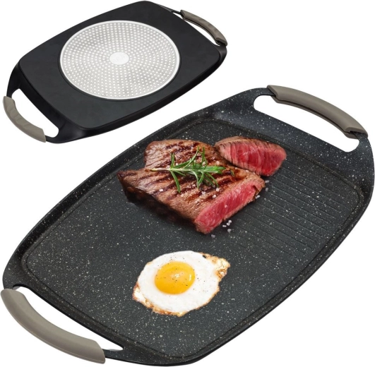 Dubbelzijdig te gebruiken plaat met twee zones – een gladde helft voor pannenkoeken, eieren of zeevruchten en een geribbelde helft voor duidelijke grillstrepen op vlees en groenten. De robuuste aluminium body met vijflaagse granieten coating weerstaat hoge temperaturen en plotselinge veranderingen en zorgt voor gelijkmatige garing zonder aan te bakken.