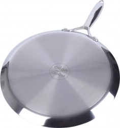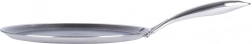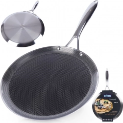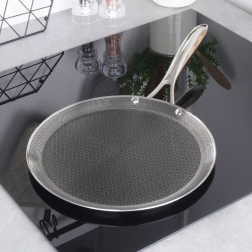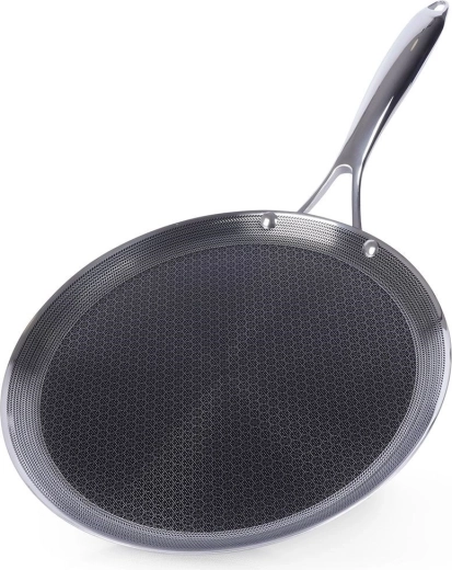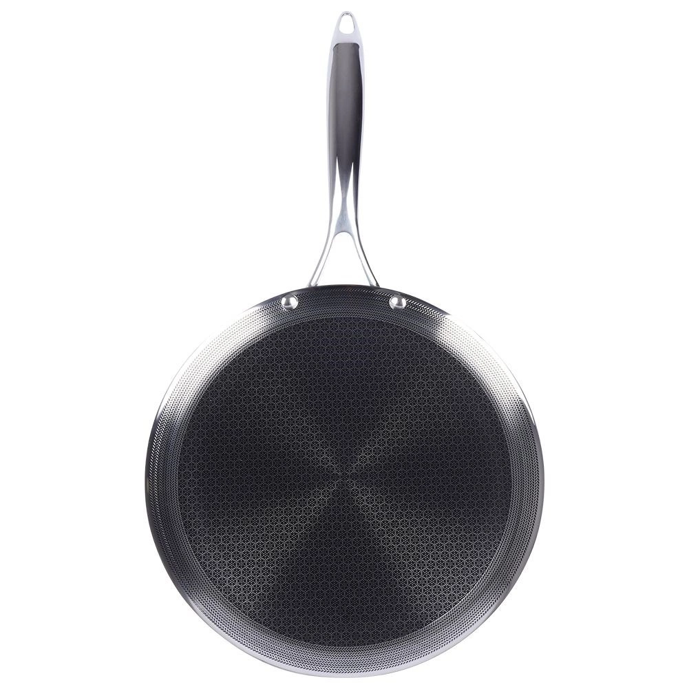 Premium rvs pannenkoekenpan met een hybride antiaanbakstructuur voor snel en gelijkmatig bakken. Geschikt voor alle soorten kookplaten inclusief inductie, oven tot 260 °C en vaatwasser. Krasbestendig, geschikt voor metalen keukengerei en dankzij de lage rand ideaal voor het omdraaien van pannenkoeken, pancakes en omeletten.