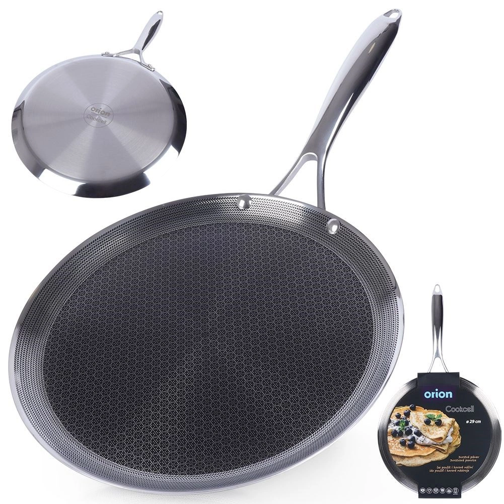Deze rvs pannenkoekenpan uit de COOKCELL HYBRID-lijn biedt topklasse antiaanbakeigenschappen en een lange levensduur. De speciale oppervlaktestructuur zorgt voor eenvoudig loslaten van gerechten, hoge temperatuurbestendigheid en het gebruik van metalen tools.