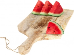 Dankzij de royale afmetingen snijd je comfortabel vlees, brood, groente en fruit en serveer je op dezelfde plank kazen, vleeswaren of snacks. De praktische handgreep met opening en koord maakt eenvoudig ophangen en dragen mogelijk. Mangohout is van nature vochtbestendig, vervormt niet, neemt geen geuren op en droogt snel.