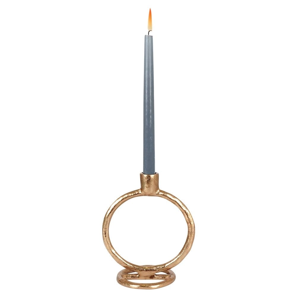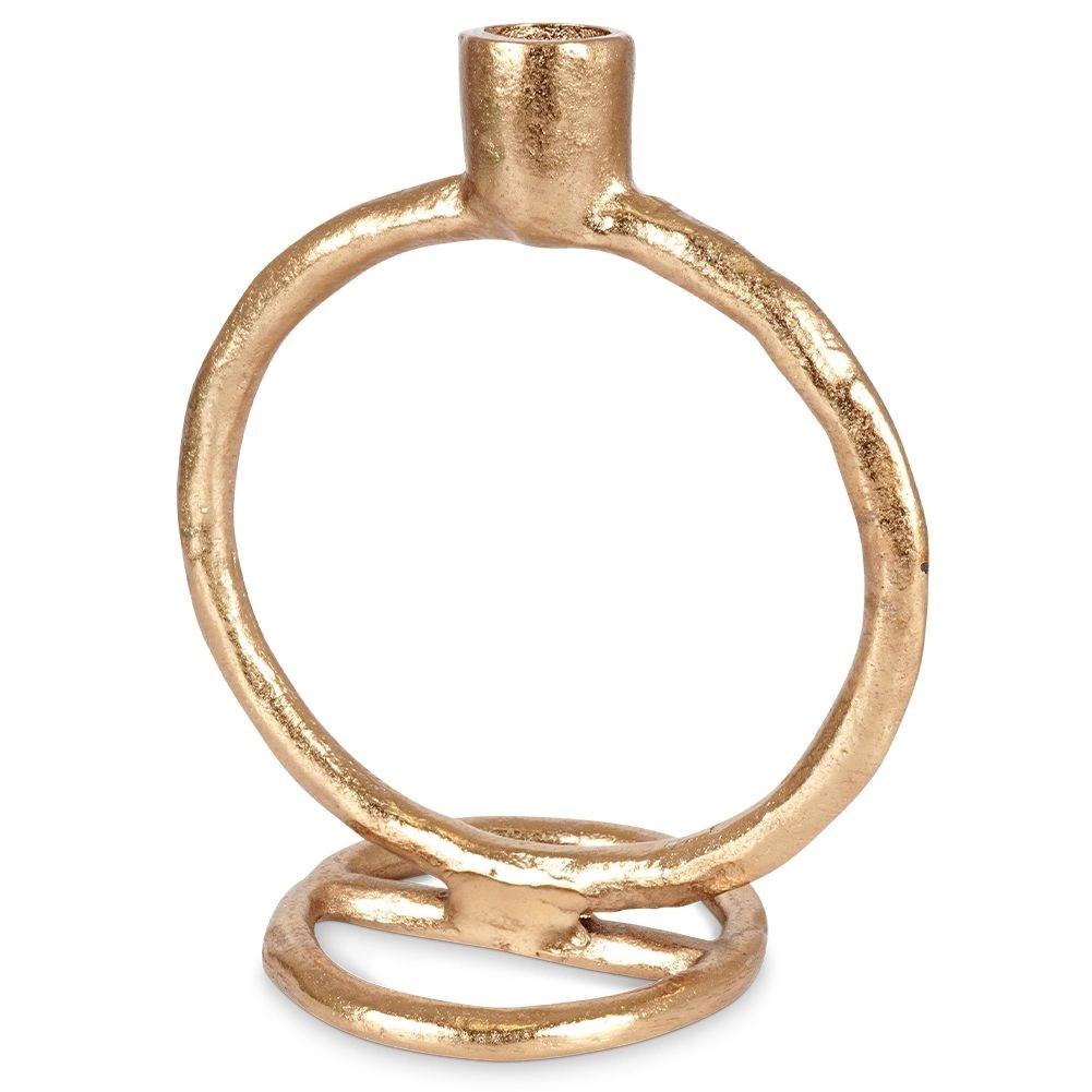 Stijlvolle kandelaar van aluminium in een gouden uitvoering voor lange kaarsen met een diameter tot 2 cm. Biedt een stabiele ronde basis, een elegante minimalistische look en een industriële loftstijl die elke inrichting prachtig aanvult.