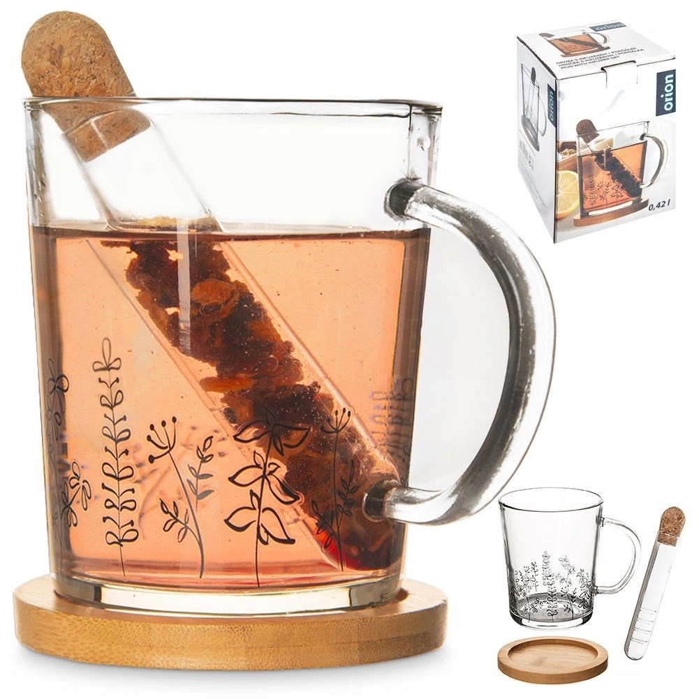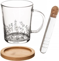 Geniet met elegantie van je favoriete thee of kruiden. De glazen mok van 400 ml wordt aangevuld met een glazen infuser met kurken dop en een glad bamboe schoteltje. Het transparante glas met subtiele botanische motieven laat de kleuren van de drank stralen en maakt van elk moment een klein ritueel.