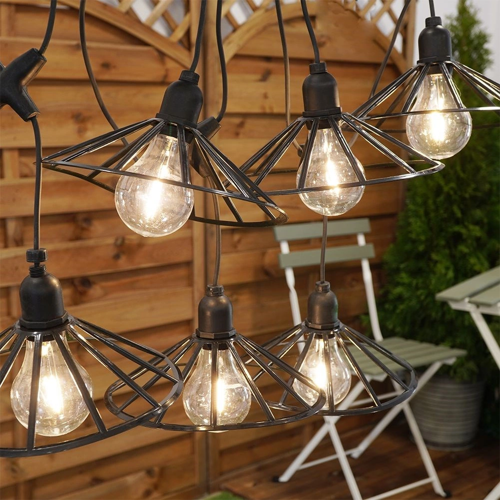 Deze decoratieve lichtslinger geeft je buitenruimte een gezellige toets. Zes heldere LED-lampen met warme lichtkleur in elegante zwarte kooitjes verspreiden het licht gelijkmatig en creëren een prettige sfeer voor dagelijks samenzijn en feestelijke gelegenheden.